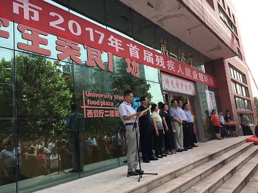 图为:市政协副主席马卫红宣布2017年首届残疾人招聘会开幕