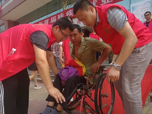 图为:助残志愿者为残疾人提供帮助